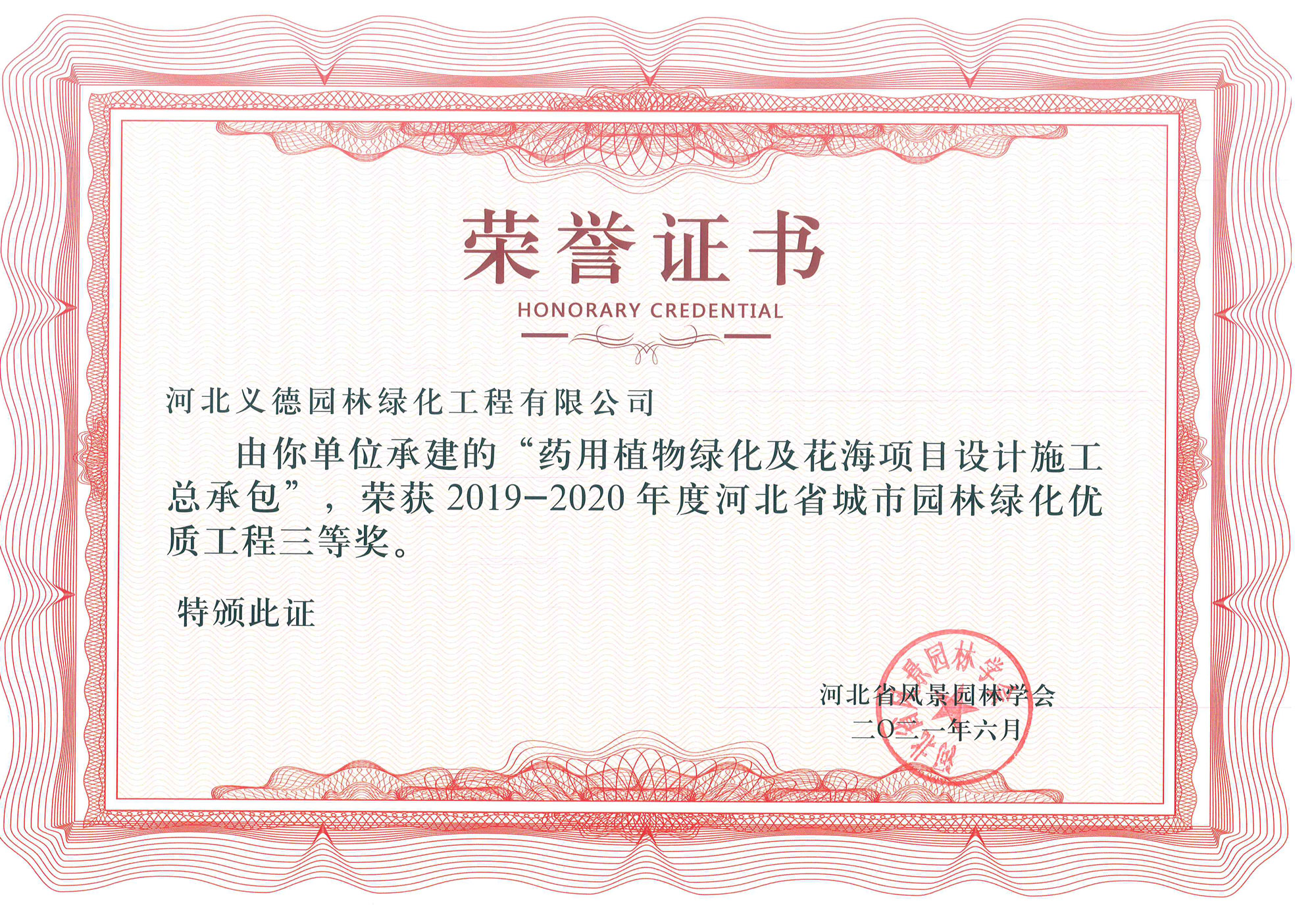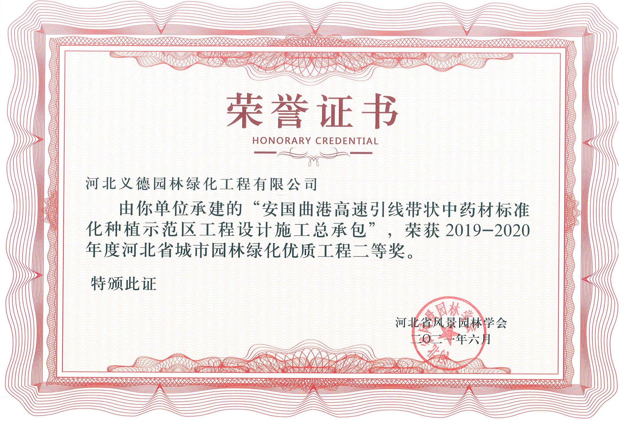 近幾年來我公司被授予2019年-2022年河北省扶貧龍頭企業、2018年國家林業標準化示范企業、2019年度全國苗圃50強、2018-2019年度河北省林業重點龍頭企業、2018年保定市精品特色現代農業園區、2018年度保定林木種苗協會授予特色苗圃、2018年度北方十佳特色苗圃、2016-2019年河北省建設工程招標投標誠實守信5A級施工企業等榮譽稱號,2017年保定市林木種苗龍頭企業、石家莊市2017年度優秀園林企業。